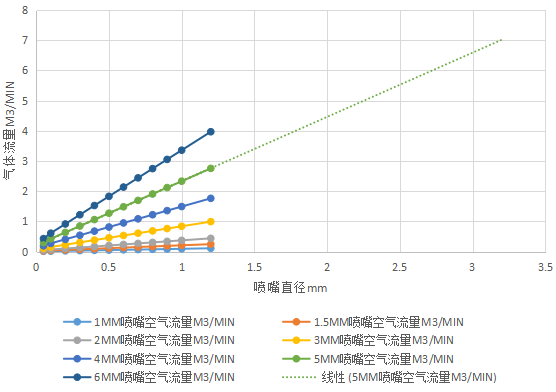 縱坐標(biāo)為氣體流量測(cè)試數(shù)值,橫坐標(biāo)為調(diào)整設(shè)置不同氣體壓力變化,不同顏色表示的是不同噴嘴直徑的測(cè)試條件。從上表圖形可以看出,流量是由設(shè)置氣體壓力和噴嘴直徑?jīng)Q定的,并是線性正相關(guān)性。